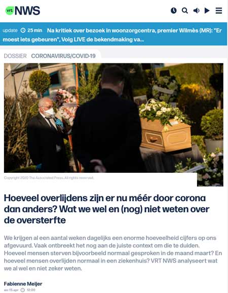 Ежедневные отчеты о COVID-19 смертности — какофония: мы не знаем точно, является ли коронавирус более смертельным заболеванием, чем, к примеру, тяжелая форма гриппа; В 2018 году больницы Бельгии были перегружены пациентами с гриппом, а количество смертей в марте составляло 390 в день. 85% людей, скончавшихся от коронавируса, имели какое-либо сопутствующее заболевание.