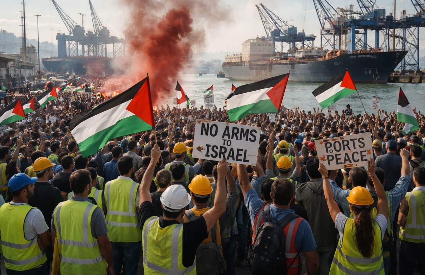 Работники портов в девятнадцати ключевых гаванях Средиземноморья с пятницы после обеда прекращают работу. Так они протестуют против расширения военной индустрии и геноцидального насилия в Газе. Участники акции требуют, чтобы порты стали «местами мира», а не элементами военной логистики.